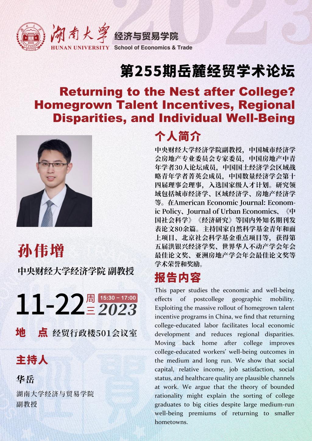 孙伟增:Returning to the Nest after College? Homegrown Talent Incentives, Regional Disparities, and Individual Well-Being