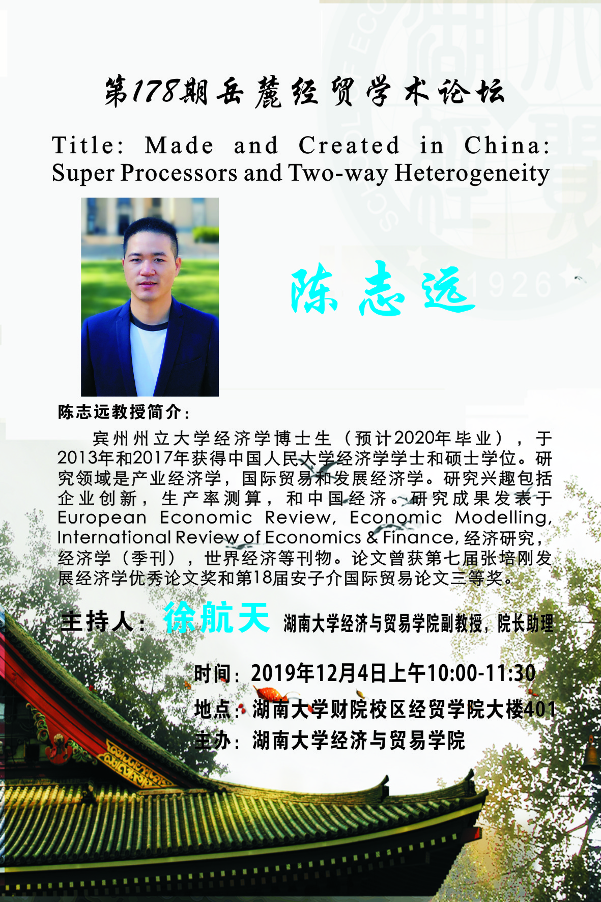 陈志远:宾州州立大学经济学博士生(预计2020年毕业),于2013年和2017年获得中国人民大学经济学学士和硕士学位。研究领域是产业经济学,国际贸易和发展经济学。研究兴趣包括企业创新,生产率测算,和中国经济。研究成果发表于European Economic Review, Economic Modelling, International Review of Economics & Finance, 经济研究,经济学(季刊),世界经济等刊物。论文曾获第七届张培刚发展经济学优秀论文奖和第18届安子介国际贸易论文三等奖。