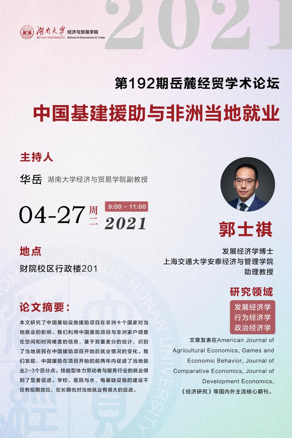 主讲人:郭士祺,发展经济学博士,上海交通大学安泰经济与管理学院助理教授。研究领域:发展经济学,行为经济学,政治经济学。文章发表在American Journal of Agricultural Economics, Games and Economic Behavior, Journal of Comparative Economics, Journal of Development Economics, 《经济研究》等国内外主流核心期刊。