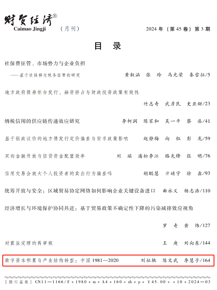 刘征驰教授、陈文武、李慧子博士合作撰写的学术论文《数字资本积累与产业结构转型:中国1981-2020》在《财贸经济》2024年第3期刊出。《财贸经济》期刊是是中国社会科学院主管,中国社会科学院财经战略研究院主办的重要学术期刊。