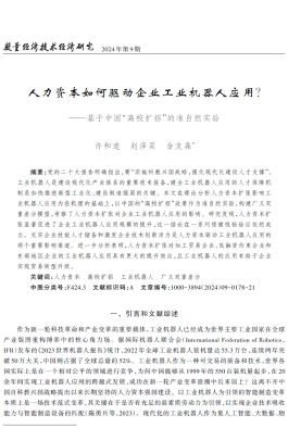 本文从人力资本的视角出发,基于中国科教兴国战略中的重要实践——1999年“高校扩招”政策构建广义双重差分模型,首次考察了人力资本扩张对中国企业工业机器人应用的影响及其内在作用机制。研究结果表明:(1)在“高校扩招”引起的人力资本扩张发生后,相较于低人力资本强度行业而言,高人力资本强度行业中的企业工业机器人应用规模获得了更大幅度的增长,表明人力资本扩张显著促进了中国企业对工业机器人的应用,这一结论在一系列稳健性检验后依然成立。(2)充实企业技能人才储备和激发企业技术创新活力是人力资本扩张促进工业机器人应用的两个重要影响渠道。(3)人力资本扩张对工业机器人应用存在异质性影响,其促进作用在加工贸易企业、低融资约束企业和东部地区企业中更为明显。(4)工业机器人应用有效推动了企业的贸易转型升级。