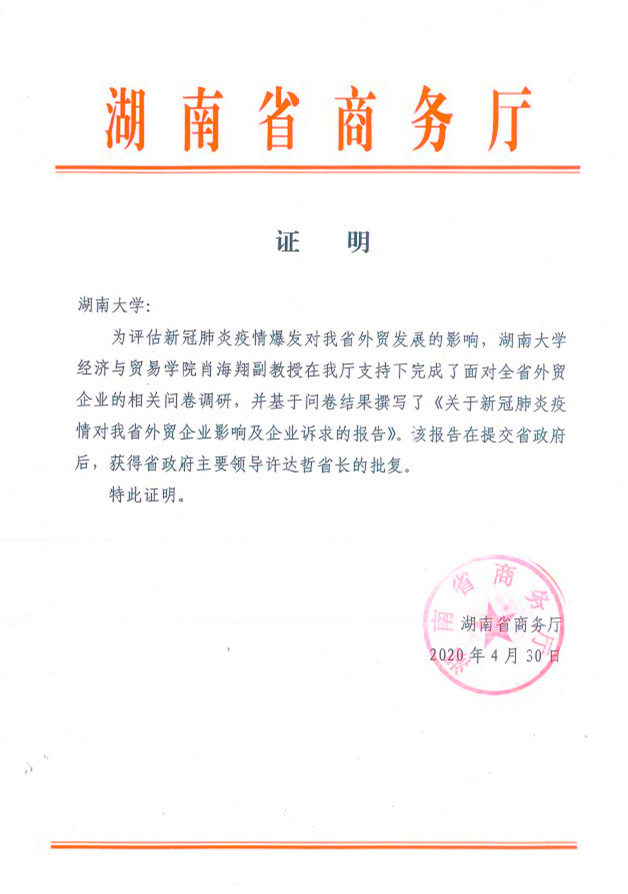 近日,从湖南省商务厅传来消息;为评估新冠肺炎疫情爆发对我省外贸发展的影响,人体艺术 肖海翔副教授在我厅支持下完成了面对全省外贸企业的相关问卷调研,并基于问卷结果撰写了《关于新冠肺炎疫情对我省外贸企业影响及企业诉求的报告》。该报告在提交省政府后,获得省政府主要领导许达哲省长的批复。