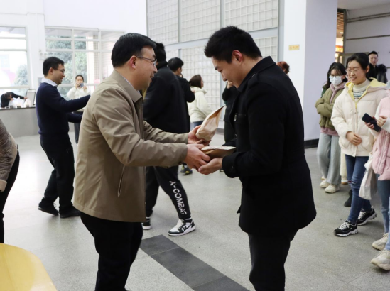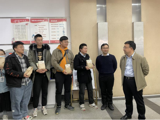 学院领导向考研学子表达了细致的关怀和殷切的期盼,并为大家分发了精心准备的“考研加油包”。祝树金高度赞扬了所有刻苦备战的同学,对同学们敢于拼搏、勤勉踏实的品质给予肯定,表示考研经历必将成为同学们人生中一笔宝贵的精神财富,提醒大家要合理安排作息,注意饮食营养,为自己的生活做好保障。并鼓励同学们在备战的最后半个月里继续发扬奋发刻苦的精神,认真备考,旗开得胜。