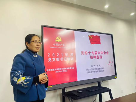 党委副书记李曼分别为经贸院全体学生党支部书记和教工行政党支部、本科生学生国贸一支部作十九届六中全会精神宣讲报告。希望老师们深刻领会党的十九届六中全会精神实质,从党的百年奋斗历程中汲取前进的智慧和力量,把学习成果转化为推进工作的强大动力。
