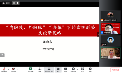 本次暑期学校以“经济发展新常态与高质量发展”为主题,中国社会科学院工业经济研究所纪委书记张其仔、第九届中国财政学会常务理事潘向东分别以“提升产业链供应链现代化水平,加快发展现代产业体系”、“‘内防疫、外防胀’‘共振’下的宏观形势及投资策略”为主题作主报告分享。