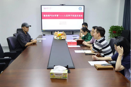 为光荣入伍的本科2021级学生迪力木拉提·艾买提江举行欢送会并进行座谈交流。学院党委书记祝树金,党委副书记李曼,学工办主任蔡婕萍,辅导员胡煊赫、艾克帕尔·吐地参与交流。