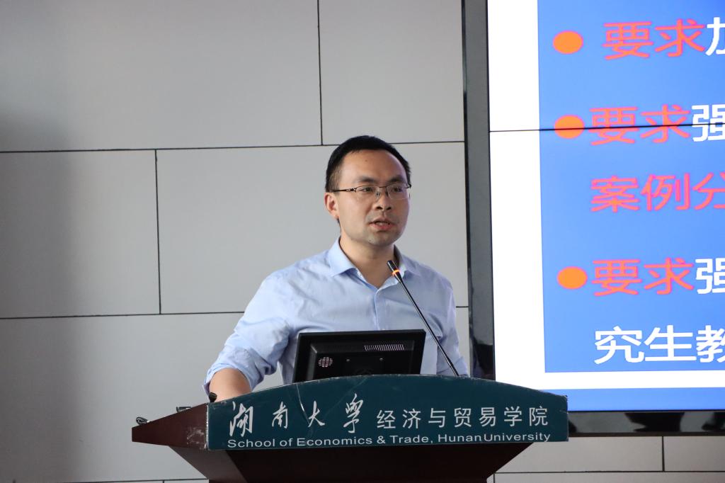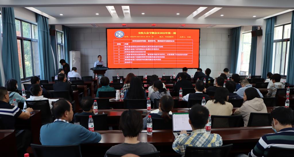 在经贸大楼201会议室召开2022年第一期全院大会“研究生教育专题:案例研究、案例教学与案例论文”专题会议,特邀请湖南大学工商管理学院朱国玮教授做专题讲座。学院全体教职员工参加会议,会议由副院长肖皓主持。