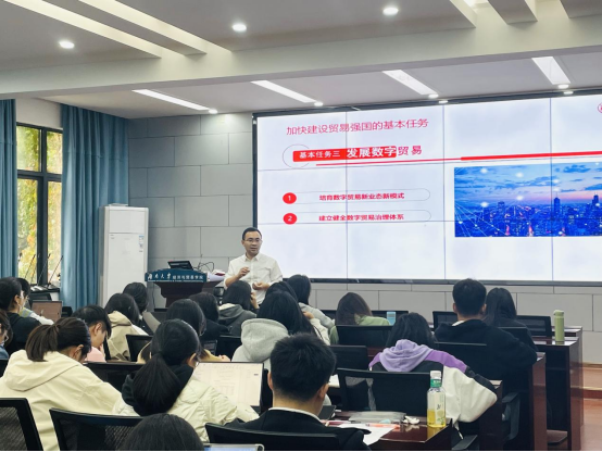 肖皓以“是什么-为什么-怎么做”为基本框架,从重大意义、基本内涵和主要任务三个方面,层层深入,向同学们讲述党的二十大报告提出的“加快建设贸易强国”的新目标。他从立足构建新发展格局、满足人民美好生活需求、应对百年未有之大变局和构建人类命运共同体四个维度,阐释建设贸易强国是全面建设社会主义现代化国家的必然要求,具有重大而深远的意义。