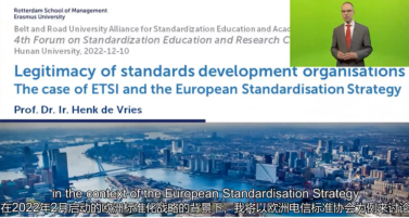荷兰伊拉斯姆斯大学鹿特丹管理学院教授、欧洲标准化学会主席Henk de Vries围绕“标准组织的合法性”主题展开演讲。在2022年2月启动的欧洲标准化战略背景下,Henk de Vries以欧洲电信标准协会为例,对标准组织的合法性问题进行阐述。他指出要区别输入、使用和输出合法性以及规范合法性和经验合法性,并说明了标准化是一个重要的工具,期待全球层面的共同标准化能够得到进一步发展。