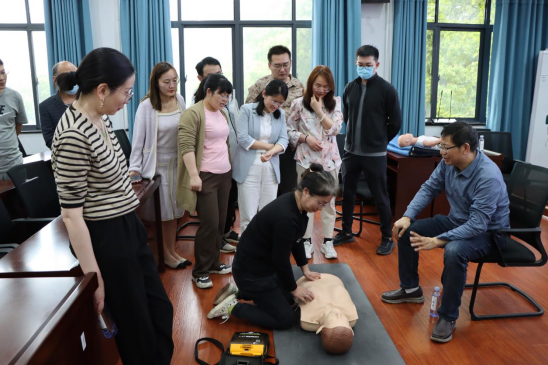 在校医院沈新强等三位医生进行模拟培训,培训采用“课程讲解+ 操作示范+ 学员练习+ 现场指导”等多元化教学方式。三位医生分别就校园常见急救场景如气道异物梗阻、心搏骤停等,讲授和演示了海姆利克急救法、成人心肺复苏、自动体外除颤器和急救处置流程。教职工分成2个小组在专业医师指导下进行模拟心搏骤停的情境,练习单人与双人心肺复苏及AED使用技能,此次活动圆满完成。