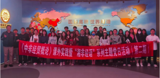 4月26日,《中非经贸概论》课外实践暨“湘非经语”系列主题党日活动在湖南高桥大市场进行。学院副院长肖皓教授携中非经贸概论课程班级同学与学院研究生导师团队第5党支部成员参观中非经贸博览会常设展馆以及湖南小咖主咖啡有限公司,了解并学习湖南对非经贸实践和非洲咖啡文化内容。
