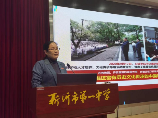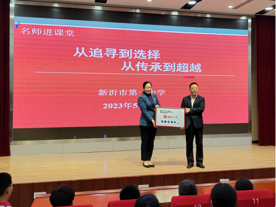 李曼代表学校向新沂市第一中学授予湖南大学"优质生源基地",并以“从追寻到选择,从传承到超越”为主题与学弟学妹们进行了交流,详细介绍和展示了湖南大学校园生活、招生政策、人才培养、学生就业等内容,鼓励同学们厚积薄发,明确方向,积极报考湖南大学。