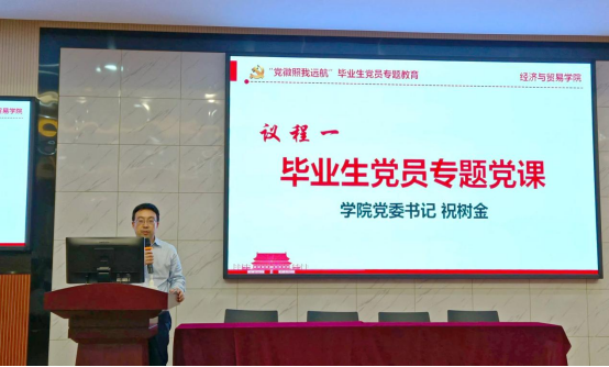 “党徽照我远航”毕业生党员专题教育活动在老食堂二楼大报告厅举行。学院党委书记祝树金、党委副书记李曼、毕业生辅导员田丽靖、肖遥出席,李曼老师主持,全体毕业生党员参加。