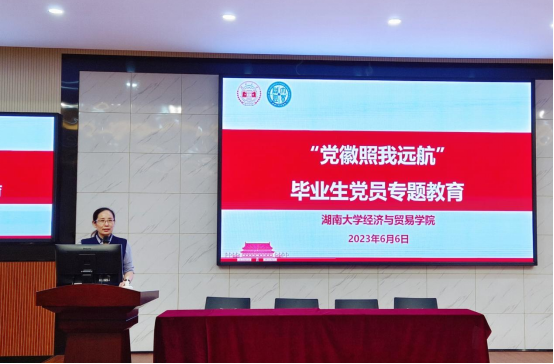 学院党委书记祝树金老师讲授专题党课,教导同学们要不忘初心、筑梦远航,争做新时代好青年。祝书记从总书记的“青年观”、总书记心中的新时代好青年和毕业生党员如何筑梦践行三个角度展开,勉励同学们点亮青春理想,激昂奋斗旋律,澎湃创新动力,淬炼斗争精神。强调毕业生们要继续加强理论学习,秉承湖南大学“实事求是、敢为人先”的校训,立足岗位职责,勇于守正创新。
