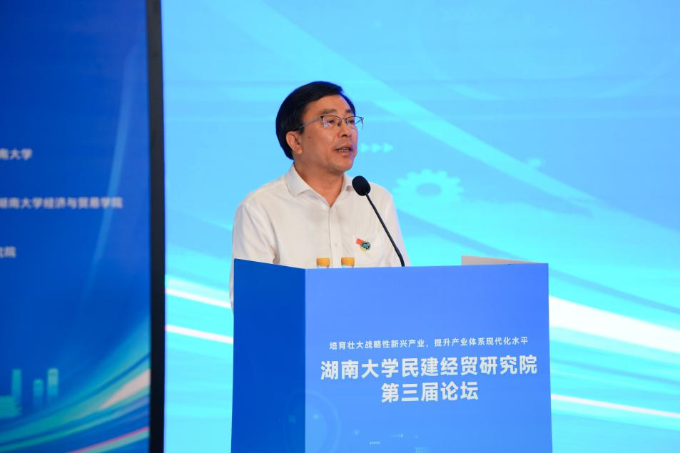 校党委书记邓卫在致辞中指出,习近平总书记指出“战略性新兴产业是引领未来发展的新支柱、新赛道”,本次论坛紧紧围绕相关主题展开研讨,充分彰显了湖南大学民建经贸研究院回答中国之问、时代之问的使命担当。学校将全力支持研究院瞄准学术前沿的新问题、社会发展的大问题、国家急迫的难问题,努力拿出湖大方案、发出湖大声音。