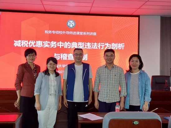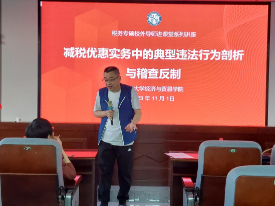 为税务硕士开展《中国税制》课程授课,授课主题为《减税优惠实务中的典型违法行为剖析与稽查反制》。学院税务相关老师及全体2023级税务专业硕士研究生参加。本课程由学院副教授、财税系支部书记唐明主持。