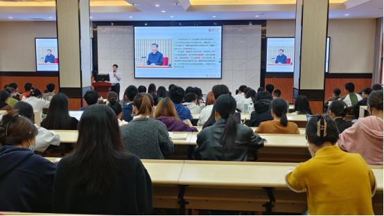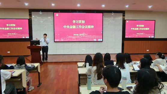 党委在财院校区老食堂二楼大报告厅召开“学习贯彻中央金融工作会议精神”专题党课。学院院长、党委委员侯俊军教授主讲,第19期发展对象和第75期入党积极分子参加党课。院学工办主任蔡婕萍主持。