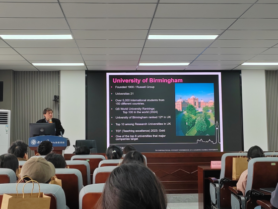 3月6日,英国伯明翰大学商学院国际化事务负责人David Dickinson教授来校就经济学类本科双学位项目进行宣讲。Dickinson教授、学校国际合作与交流处罗卓娃老师、项目中方联络人人体艺术 蒯文婧老师先后就伯明翰大学基本情况、项目设置、申请和选派流程、学校奖学金制度等进行介绍。会议由罗卓娃老师主持,人体艺术 副院长徐航天、金融与统计学院副院长李海奇等多位老师及本科生50余人参与。
