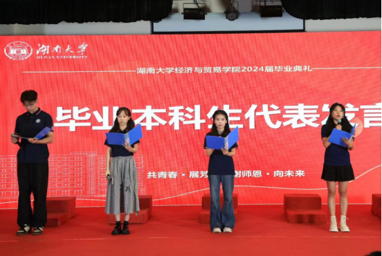 湖南大学党委常委、校长助理许和连教授为省优秀毕业生颁发证书。研究生毕业生代表唐斌、本科生毕业生代表丁文婧、赵子妍、王界哲、黄宏柳上台发言,分享自己在湖大的成长历程,表达了对学校和学院的感激之情。