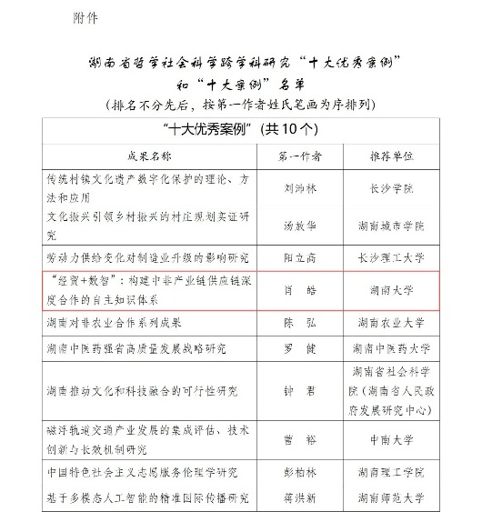 副院长肖皓教授的研究成果《“经贸+数智”:构建中非产业链供应链深度合作的自主知识体系》荣获湖南省哲学社会科学跨学科研究的“十大优秀案例”!