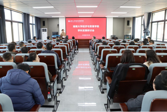 兼职教授、湖南工商大学副校长侯俊军、湖南大学非洲研究院常务副院长肖皓、湖南发展研究院副院长谢里和学院资深教授郭平、罗能生等多位校内外专家莅临指导。学院全体教职工100余人参加研讨。院长祝树金做学科建设和发展专题报告。学院党委书记邓利华主持会议。