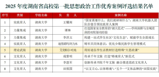 辅导员老师艾克帕尔·吐地负责的《用好退伍学生活教材打造特殊“大思政课”》获评2025年度湖南省高校第一批思想政治工作优秀案例。