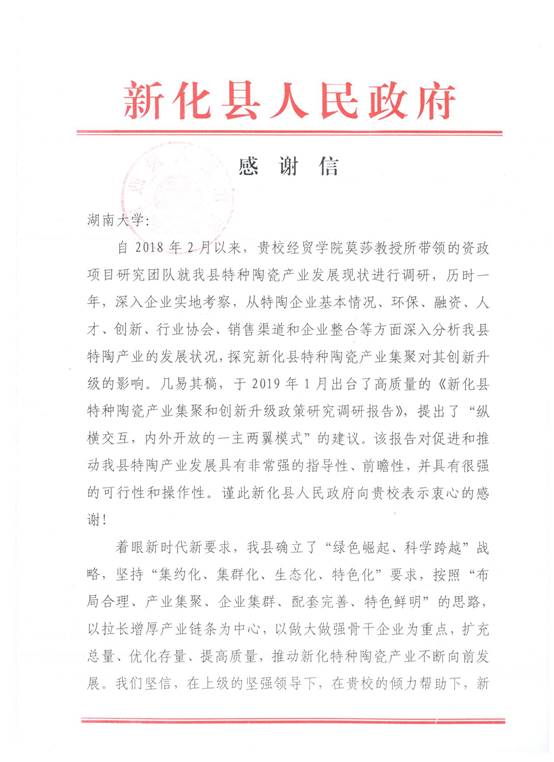 莫莎副教授带领的资政项目团队针对新化县电子陶瓷产业所做的调研报告给予了充分肯定,认为该团队提出的政策建议对推动新化县特陶产业发展具有非常强的指导性和前瞻性,并具有很强的可行性和操作性。他代表新化县人民政府送来了一份感谢信,对湖南大学和经贸学院对新化县的发展提供的支持和帮助表示感谢。