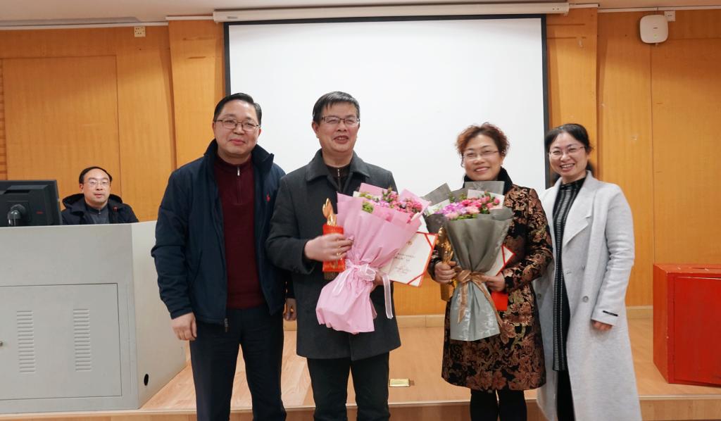 按照会议流程,学院工会主席祝树金同志主持了2018年度“感动经贸人物”表彰,获奖者罗能生、张意湘二位老师,从学院院长许和连教授手中接受了证书、奖杯及奖金!申慧敏老师作为曾经的获奖人为二位老师献花。大家用热烈的掌声为他们的兢兢业业的工作表示了由衷的祝贺。