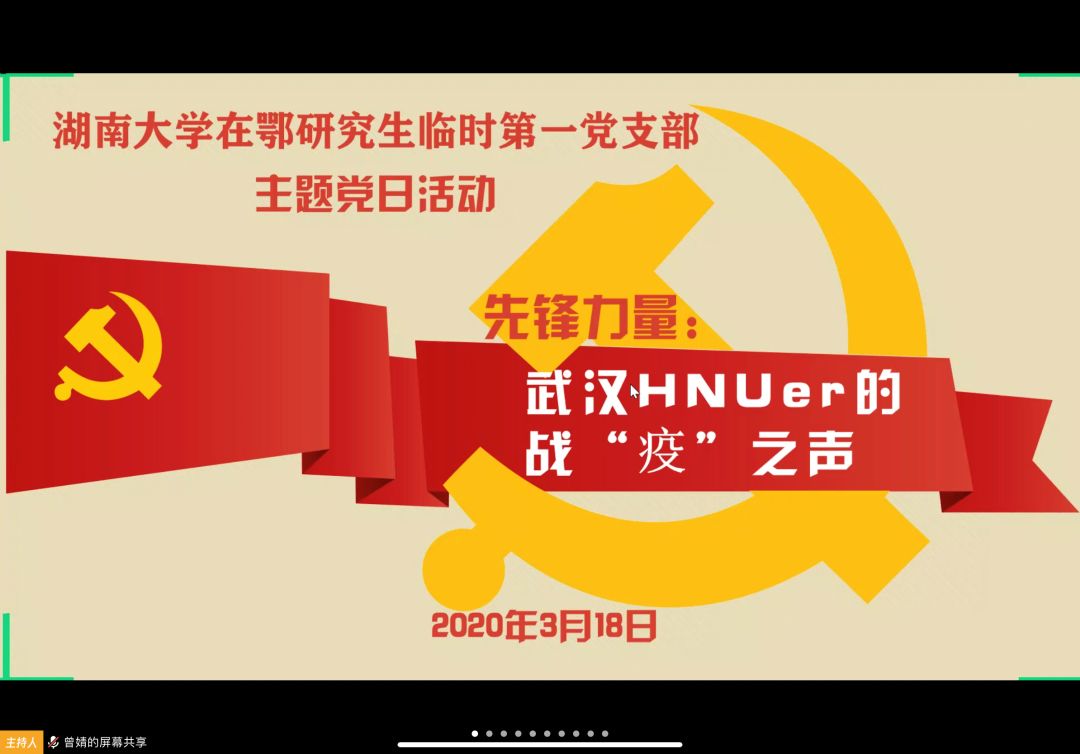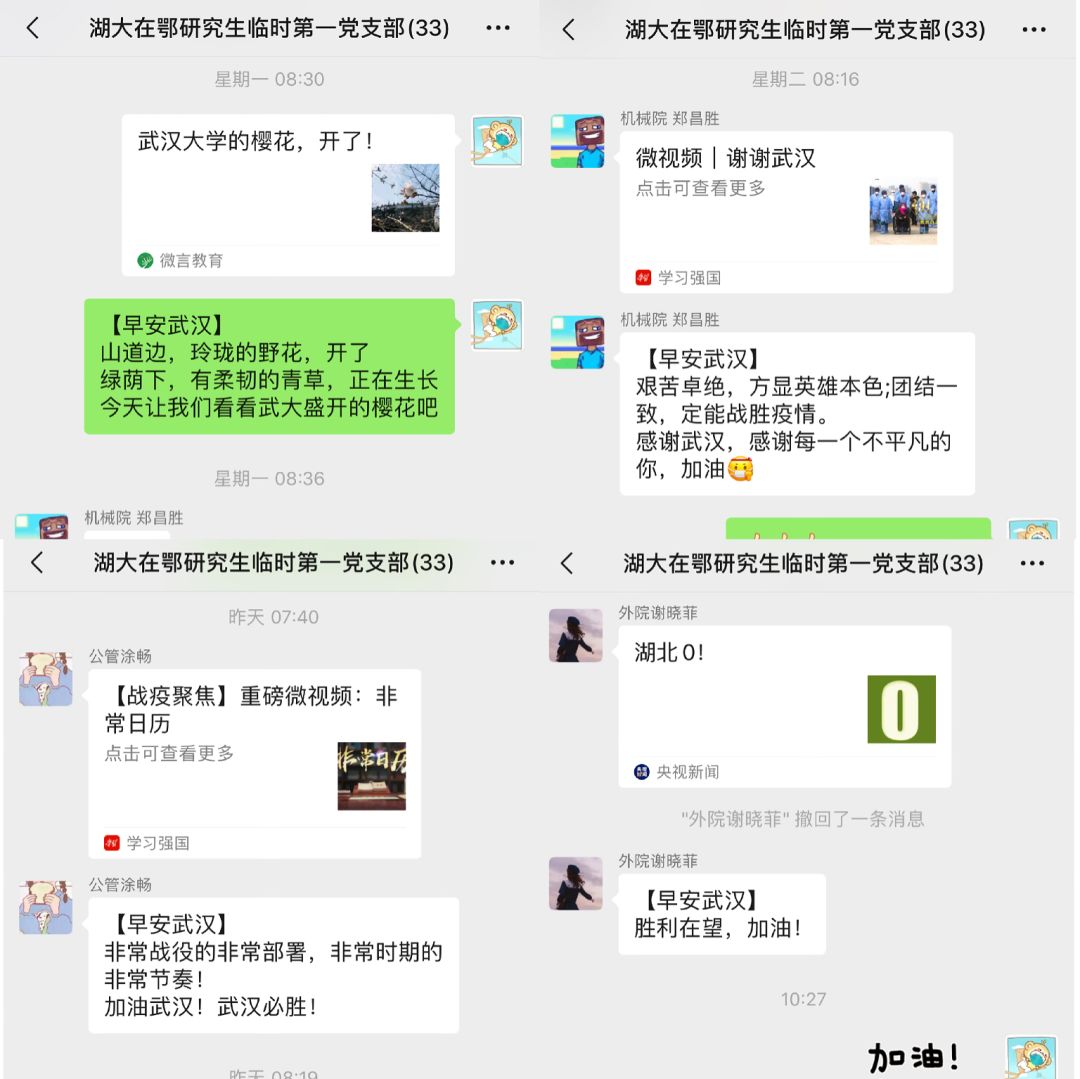 湖南大学在鄂临时第一党支部的党员和在武汉的研究生们在这场战“疫”中扮演着不同的角色,发挥着先锋力量,发出了铿锵有力的属于武汉HNUer的战“疫”之声。春天已经来临,期待相约麓山,武汉加油,中国加油!