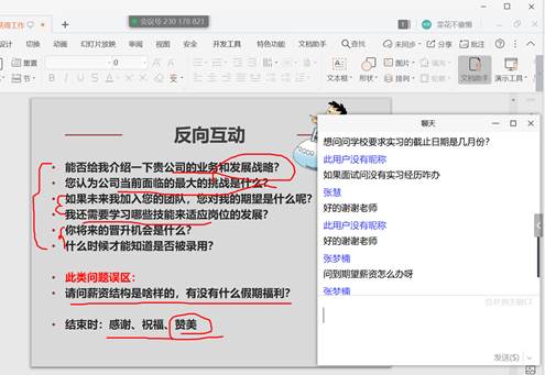 全方位提供就业指导服务。为40多名毕业学生提供一对一求职简历修改、指导服务,详细指出学生简历需完善之处,为学生获得就业机会添砖加瓦。开展线上求职面试技巧分享会,为60余名毕业生分享面试经验和注意事项,并一一为学生答疑解惑,取得成效。