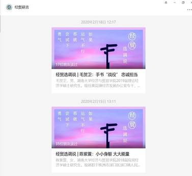 优秀毕业生们毛贺卫、陈紫萱、高爽等——奋战在抗“疫”一线的选调生们的故事,通过微信公众号分享他们的抗“疫”故事,激励和引导毕业生心系基层、勇于担当。