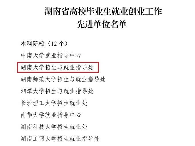 招生与就业指导处始终以“更高质量和更充分就业”为工作目标,不断拓宽高质量就业市场,开展全员、全程、全方位就业指导活动,重点引导毕业生到基层就业、主动服务国家战略就业,优化网上生源信息审核和网上签约流程,持续提升就业服务管理水平,全力支持毕业生早就业、就好业,学校获评湖南省就业创业“一把手工程”督查优秀单位(连续6次)、中国最佳高校数字化就业典范奖(全国共26所高校)等荣誉。特别是疫情期间,第一时间开展“云招聘”,组织“云指导”,对未就业学生实行“一人一策”“包干到人”,实现了疫情下就业水平总体稳定,就业经验材料被教育部、湖南省教育厅、人民日报、人民网、湖南日报等推介。