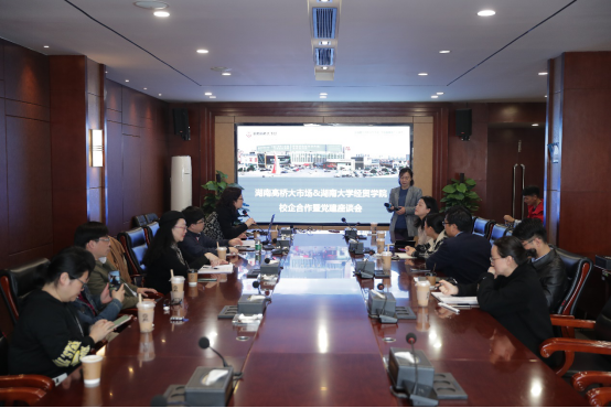 之后,经贸学院国贸系教工与湖南高桥大市场就中非经贸合作和校企合作进行座谈,展开交流。经贸学院院长侯俊军教授、国贸系系主任谢锐教授、教工党支部书记莫莎副教授等分别进行发言,在校企合作上,双方就如何促进学院在人才培养、专业建设等方面与市场经济发展需求的紧密结合展开热烈讨论,共同探索搭建双向交流机制。