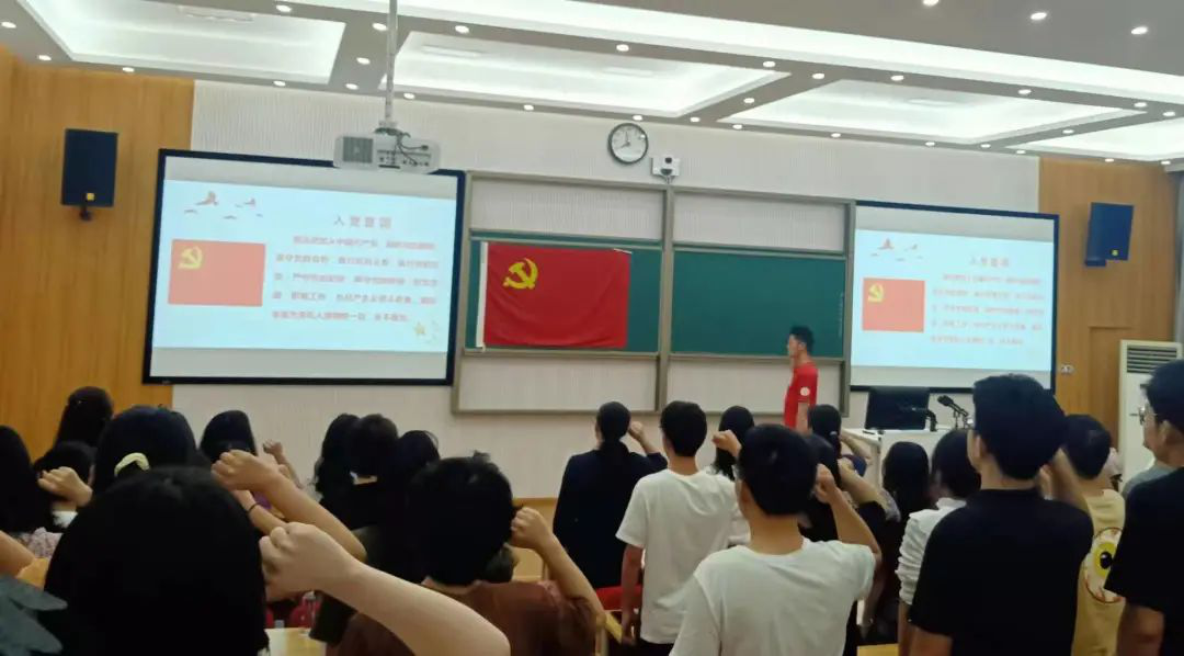 “党徽照我远航”之毕业生党员专题教育暨新发展党员入党宣誓在二教101顺利开展。本次会议由学院党委副书记李曼老师主持,全体毕业生党员、新发展党员和全体辅导员参加。