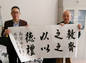 2016年4月13日上午,李松龄教授(右)为庆祝湖南大学命名九十周年及岳麓书院定名一千零四十周年,特向学院赠送其书写的书法作品。时任院长张亚斌教授代表学院接受了这份珍贵的礼物。