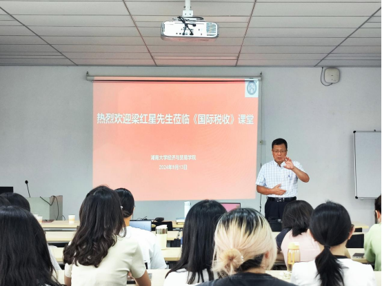 2024年9月13日上午,北京税海之星税务咨询有限责任公司总经理、国家税务总局税务干部学院外聘兼职教授梁红星为2024级税务硕士讲授《国际税收》课程的开学第一课,授课专题为《中国双边税收协定实际适用分析》。本课程负责老师肖海翔、法学院宋槿篱副教授等及全体2024级税务专业硕士研究生参加。