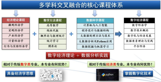数字经济专业将学科特色与国家发展需求紧密结合,旨在培养系统掌握经济学、数学和信息科学等多学科交叉知识体系,能够综合运用经济学理论、数理方法和数据分析技术和解决经济社会发展中的理论和实际问题,具备强烈社会责任感和创新精神的复合型高素质人才。