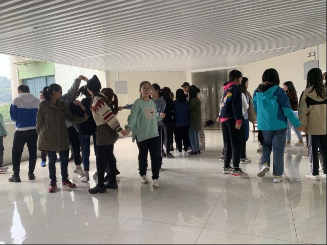 “大圈绕小圈”活动将气氛推向又一个高潮。同学们围大圈而站,双手随机拉成小圈。各小组需在规定时间内解开“小圈”,恢复“大圈”。同学们最初有些不知所措,后来通过摸索懂得了:只有协调、共同努力才能达成目标。同学们再次围圈而站,掌声充斥着整个活动空间,笑容洋溢在每个人的脸上。