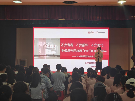 2024级新生专题思政课在财院校区小礼堂开展。学院党委书记邓利华以“不负青春,不负韶华、不负时代,争做堪当民族复兴大任的时代青年”为主题,为2024级全体新生讲授思政大课。会议由学院党委副书记李曼主持,全体2024级经贸院本硕博新生参加会议。学院党委书记邓利华围绕时间、空间介绍了学院的办学历程和治学精神,强调了学习院史和传承“经世致用”精神的重要性。她指出,“湖大经济源几许,多脉合流厚底蕴”,鼓励同学们在掌握专业知识的同时,也要深入了解学院的历史,成为具有“经世致用,明德维新”精神的经贸人才。